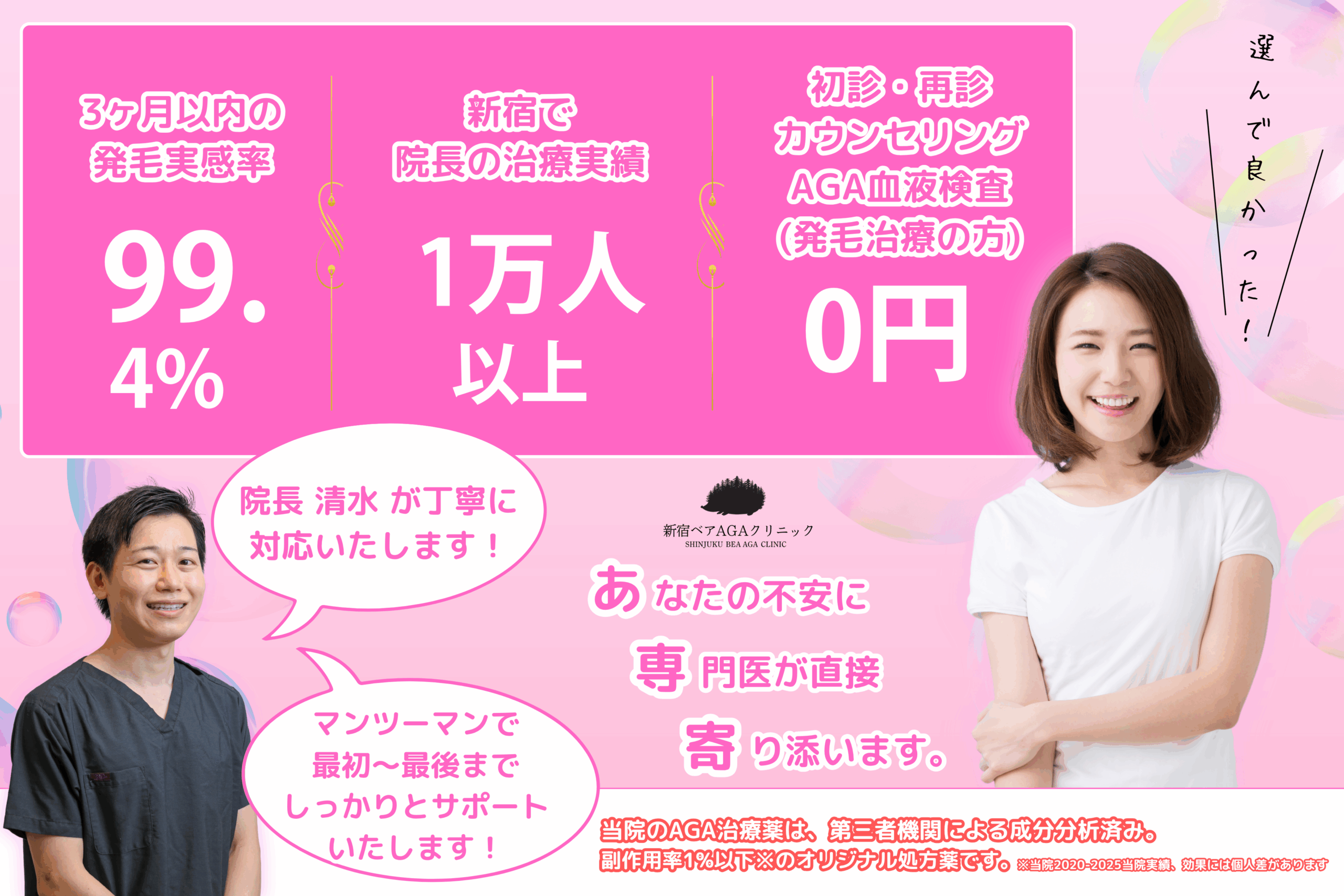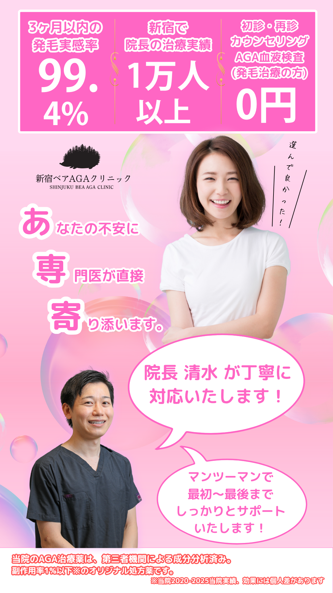 初めまして。新宿ベアAGAクリニック院長の清水と申します。2020年に地元である新宿にてベアAGAクリニックを開業いたしました。